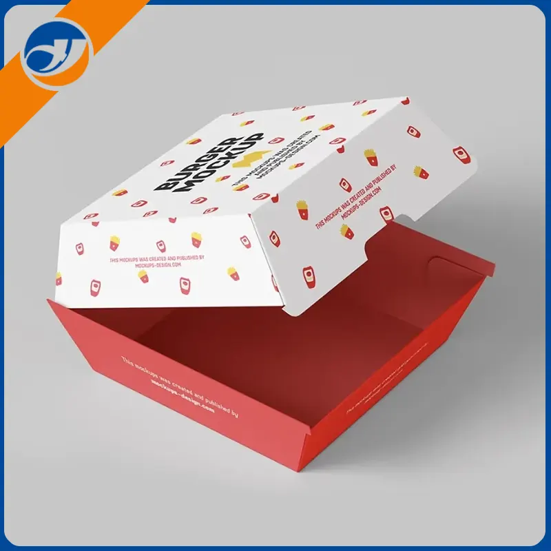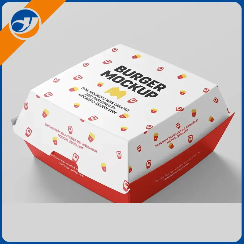 Makukulay na kahon ng hamburgerSinusuportahan ang pagsasama ng mga elemento ng tatak tulad ng logo at slogan sa disenyo upang mapahusay ang pagkilala sa tatak, habang pinasisigla ang gana sa pamamagitan ng sikolohiya ng kulay at pagpapahusay ng karanasan sa kainan.