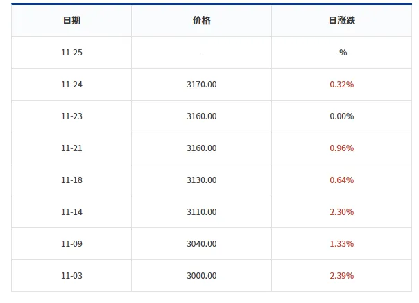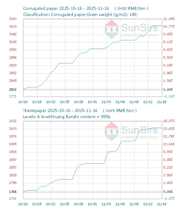 Para sa 140g/m² corrugated paper, ang mga presyo ay umakyat sa 12.09% sa pagitan ng Oktubre 16 at Nobyembre 16, 2025. Sa isang mas mahabang window (Agosto 27 hanggang Nobyembre 25), ang pinagsama -samang mga nakuha ay tumama sa 20.99%. Sa pamamagitan ng Nobyembre 24, ang pinakabagong presyo ay umabot sa 3170 RMB bawat tonelada, na may maliit na paitaas na pagsasaayos.